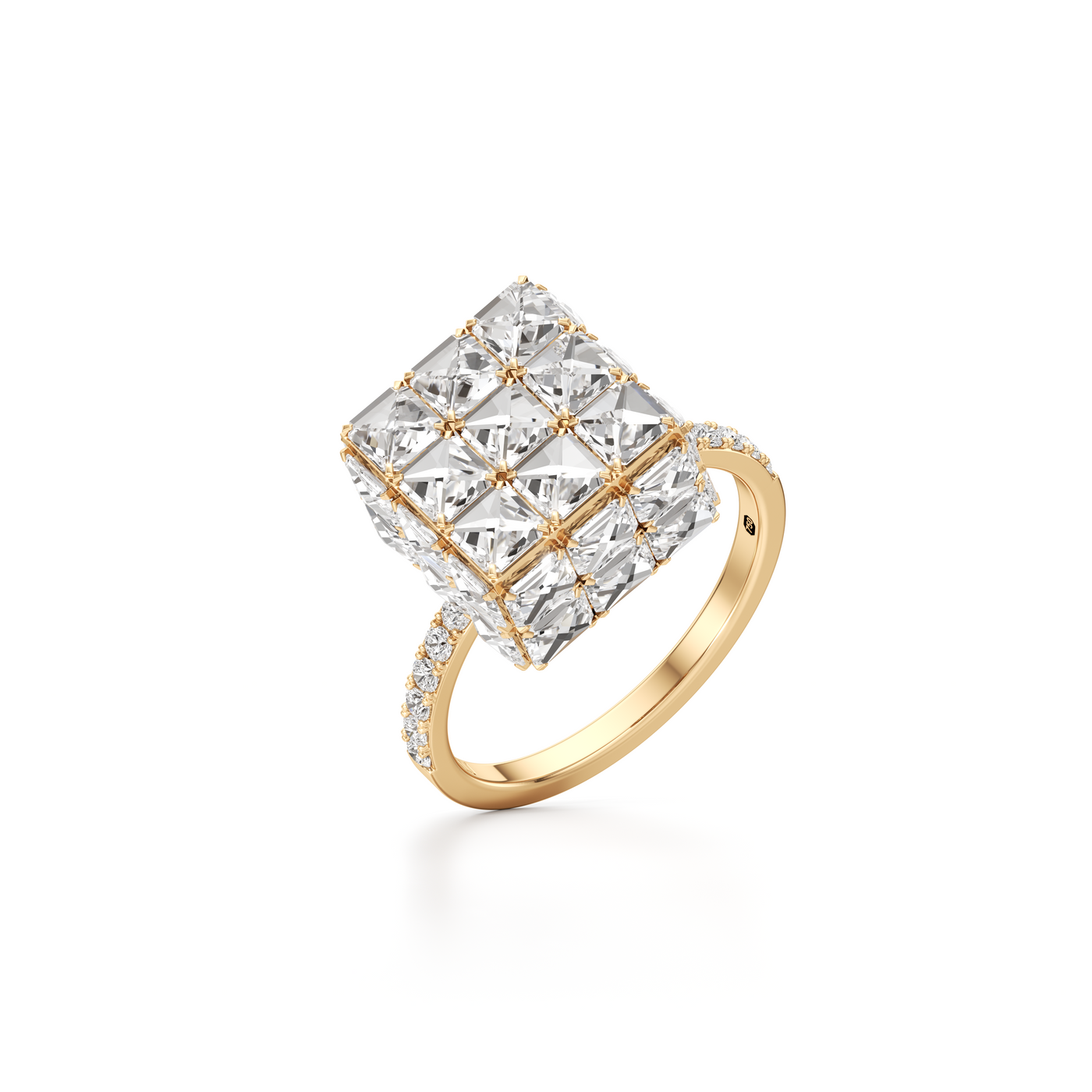 The Armor Cube Statement Diamond Pavé Ring showcases the signature Armor Square diamonds, handcrafted by our master artisans with 32 brilliant facets. Set in luminous 18K recycled gold, these diamonds are precisely set to form a sculptural, cube-like silhouette, symbolizing a silent promise of love that is fierce, fearless, and unwavering. All Unsaid jewels are handcrafted from lab-grown diamonds and 18K recycled gold. Powered by renewable energy, our methods and materials are certified carbon neutral.