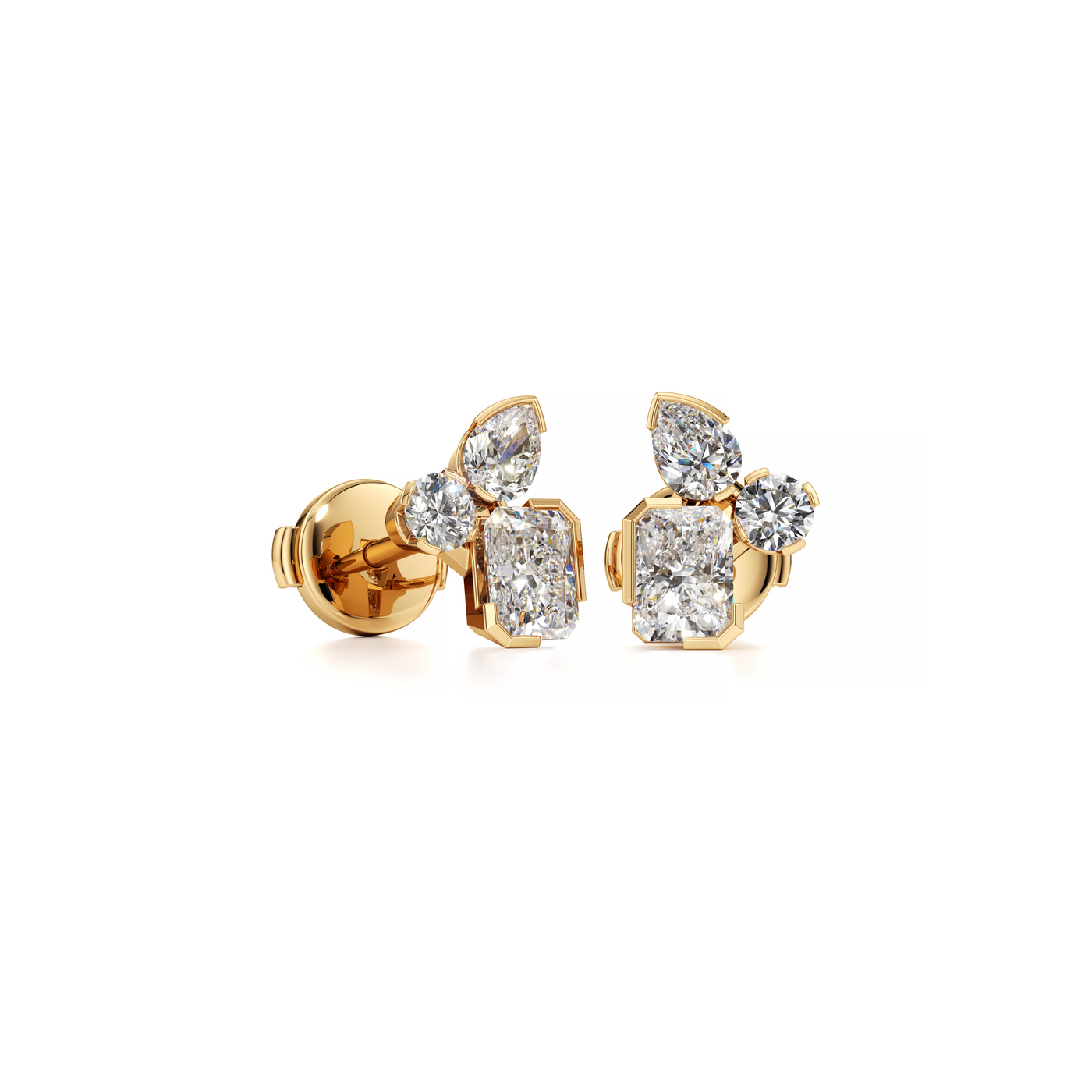 The Meta Diamond Cluster Stud Earrings present a sublime trio of round-, pear-, and radiant-cut diamonds in compelling half-bezel settings that enhance their sparkling shapes. Handcrafted by our master artisans, these diamond earrings are a symbol of change and metamorphosis. All Unsaid jewels are handcrafted from lab-grown diamonds and 18K recycled gold. Powered by renewable energy, our methods and materials are certified carbon neutral.