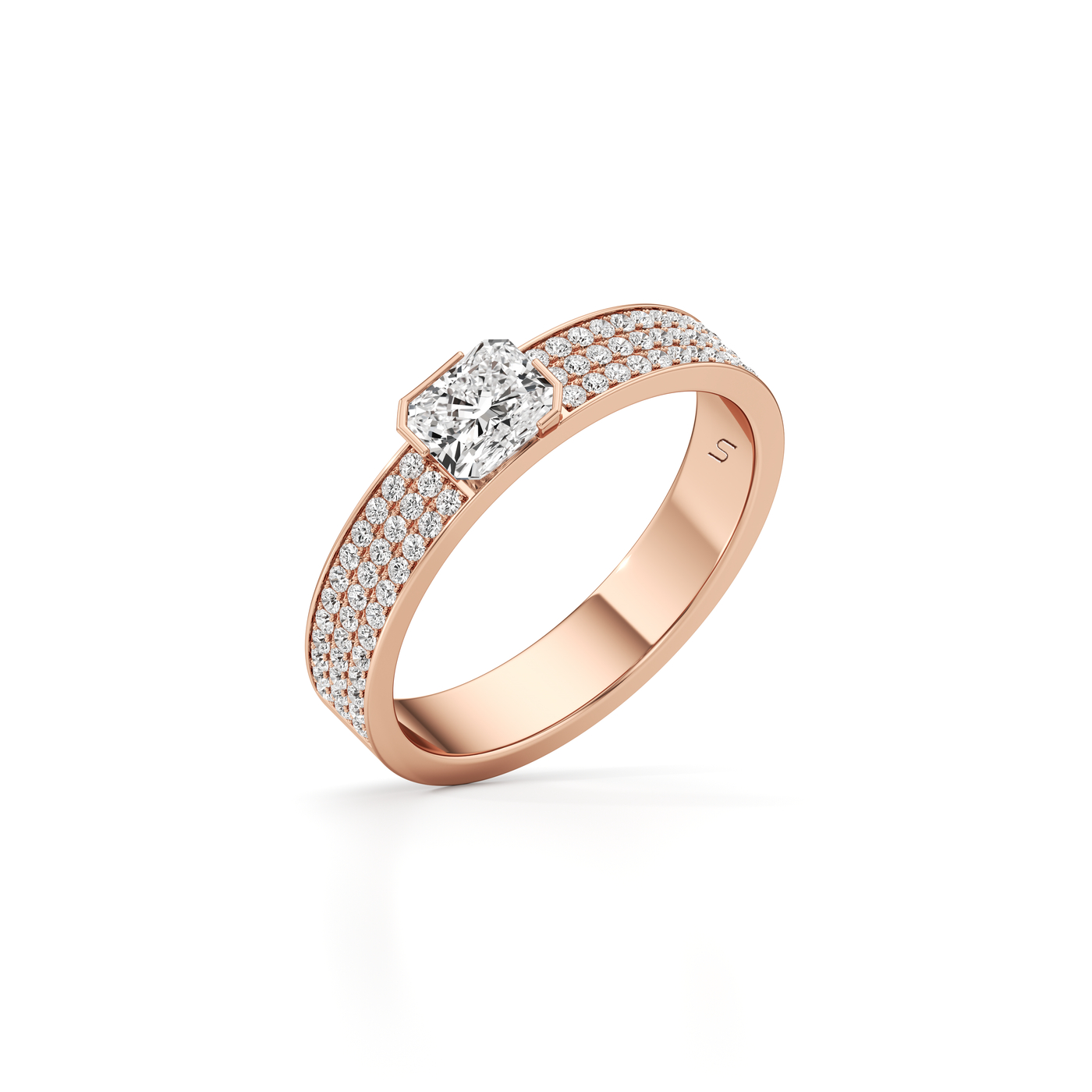 The Meta Radiant Full Pavé Signature Band reimagines the classic radiant-cut diamond to express evolution in form, complemented by pavé-set diamonds. Crafted in a half-bezel setting that reflects light with sculptural precision, this ring captures a chapter in a personal story of becoming. All Unsaid jewels are handcrafted from lab-grown diamonds and 18K recycled gold. Powered by renewable energy, our methods and materials are certified carbon neutral.
