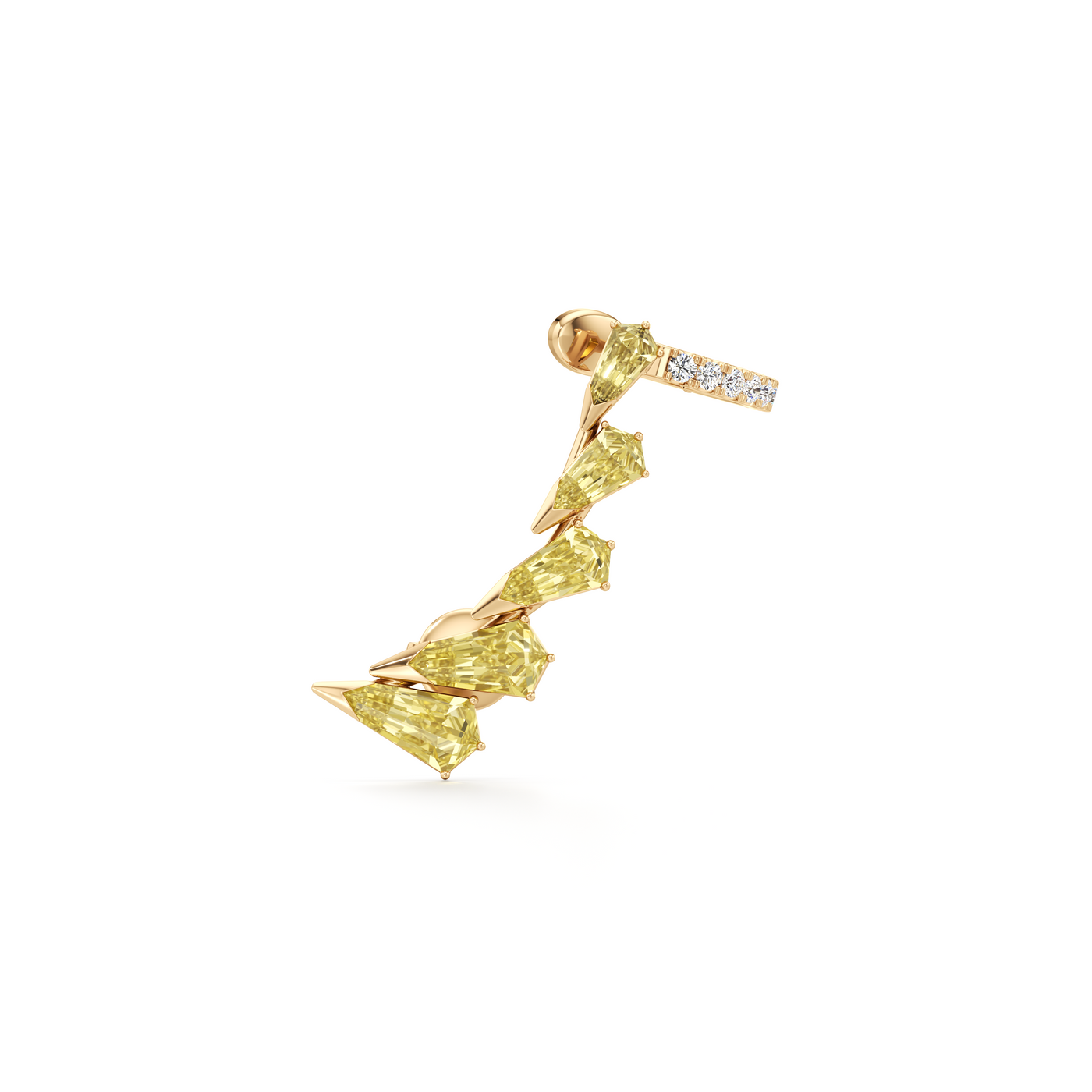 The Phoenix Diamond Cuff Earring is composed of 5 Unsaid signature Phoenix diamonds, a patented cut handcrafted by our master artisans with 33 elongated, upward-facing facets. Worn mid-ear in the style of a cuff, the diamonds are set in an ascending pattern, echoing the silhouette of the firebird in flight. All Unsaid jewels are handcrafted from lab-grown diamonds and 18K recycled gold. Powered by renewable energy, our methods and materials are certified carbon neutral.
