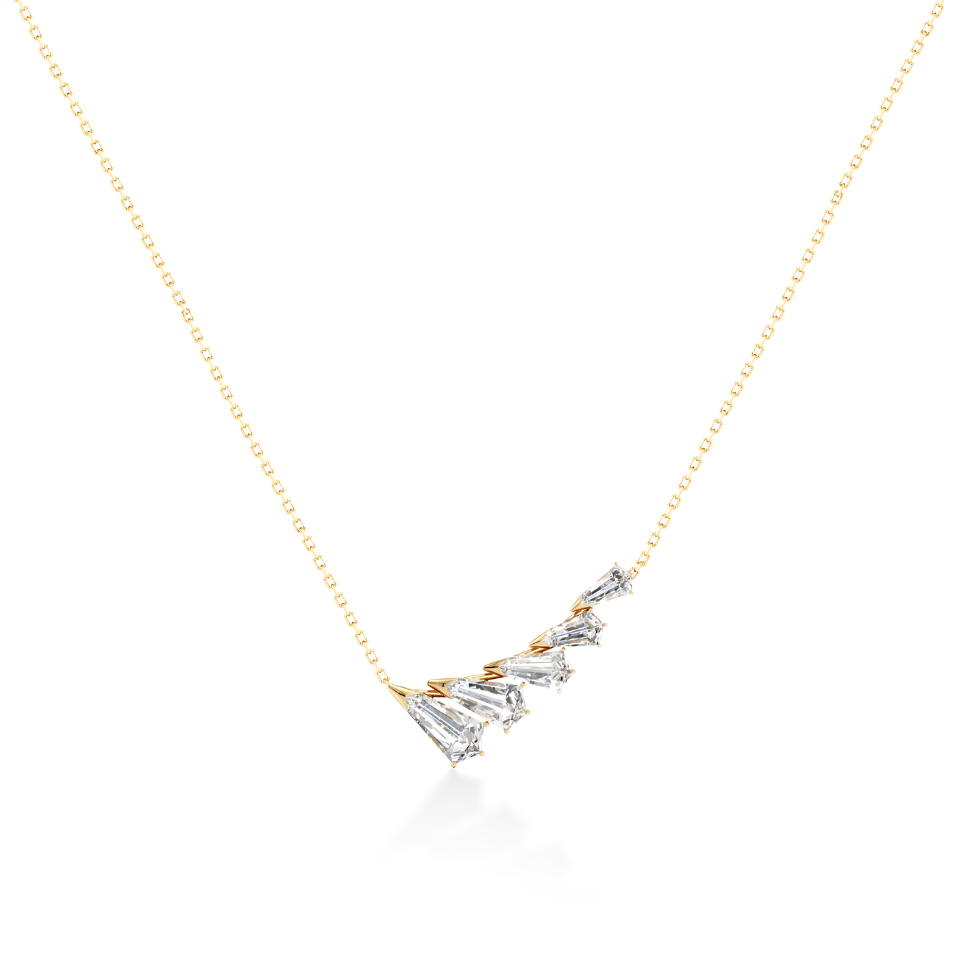The Phoenix Diamond Pendant Necklace is defined by five signature Unsaid Phoenix diamonds, a patented cut handcrafted by our master artisans for a fiery sparkle from 33 unprecedented, elongated facets per stone. Composed in a graduated setting upon a slender gold adjustable chain, this diamond pendant represents the power that lies in rebirth. All Unsaid jewels are handcrafted from lab-grown diamonds and 18K recycled gold. Powered by renewable energy, our methods and materials are certified carbon neutral.