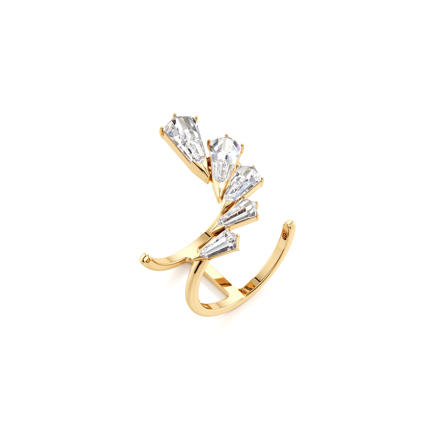 The Phoenix Diamond Wing Open Ring embraces the finger with a graduated setting of five signature Unsaid Phoenix diamonds. This patented cut is handcrafted by our master artisans for an unprecedented sparkle thanks to its 33 elongated facets per stone. A bold design for statement wear, this diamond ring is a symbol of strength and resilience in the face of any challenge. All Unsaid jewels are handcrafted from lab-grown diamonds and 18K recycled gold. Powered by renewable energy, our methods and materials are certified carbon neutral.